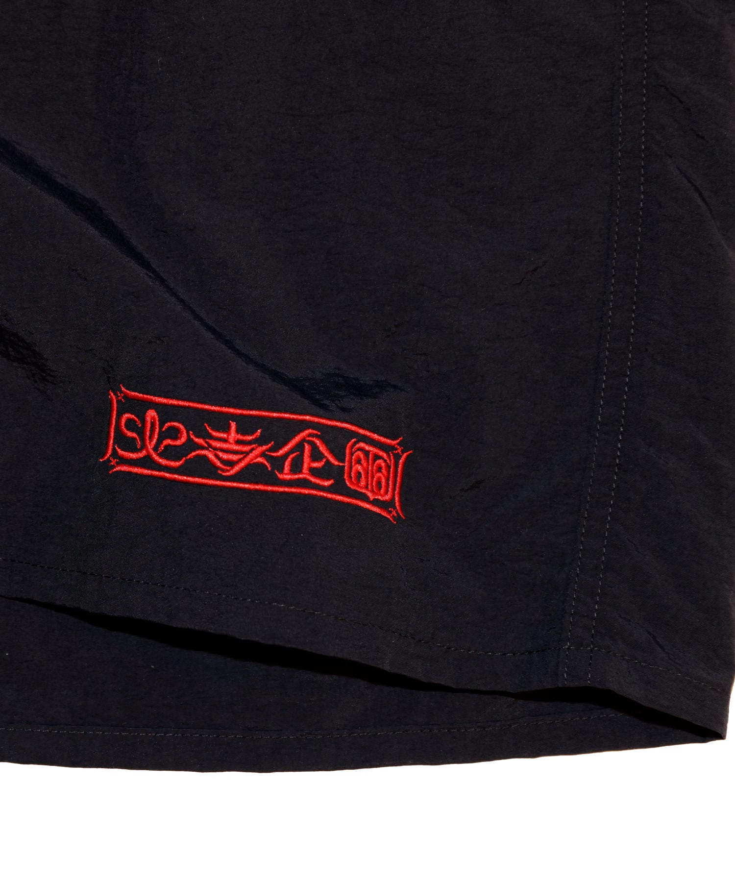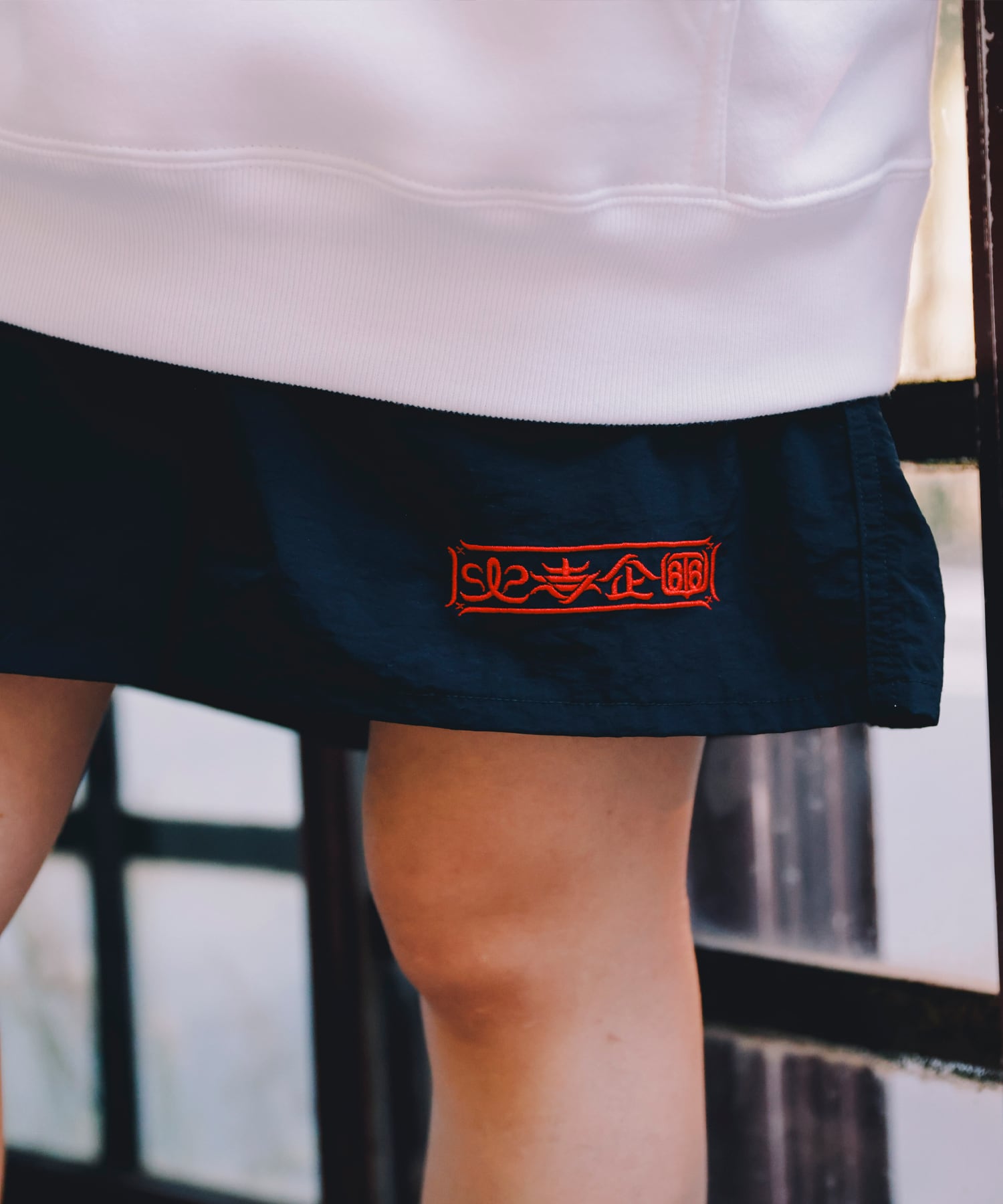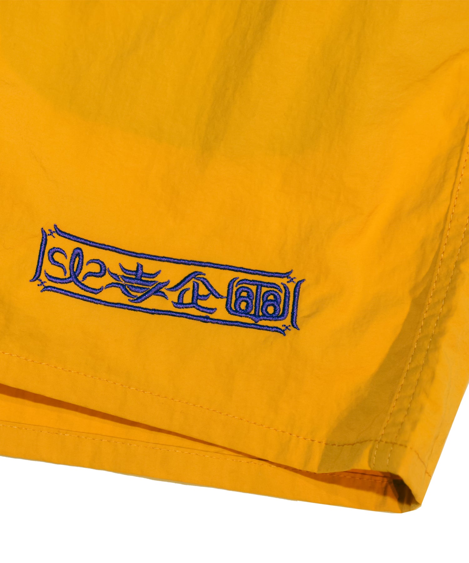 ※M, Lサイズのみの展開となります。 少し張りのあるナイロンショーツの裾に火寺企画の刺繍を施したデザインです。 ユニセックスに穿けるショーツです。 ウエストは平ゴムが入り、ドローコードが付きます。 サイドとヒップポケットの内側にメッシュ生地を採用しています。 サイズ : M / L(cm) 総丈:40.5 / 41.5 ウエスト:79~ / 85~ 股下:12 / 12 素材:ナイロン100%